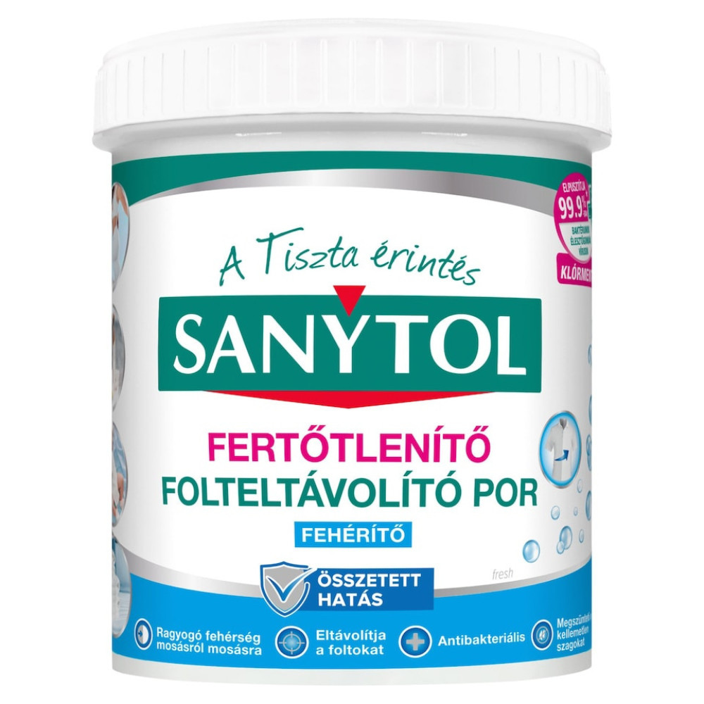 Az alacsony hőmérsékleten mosott ruhanemű nem mentes teljesen a baktériumoktól. A ruhákon jelen lévő baktériumok, élesztőgombák és vírusok rossz szagokat, bőrirritációt okozhatnak és betegségeket terjeszthetnek. A Sanytol, a klórmentes fertőtlenítés szakértője által kifejlesztett folteltávolító egy olyan hármas hatású fertőtlenítőszer, amely elpusztítja a mikrobákat, megszünteti a kellemetlen szagokat és eltávolítja a makacs szennyeződéseket, 20°C-tól. Összetétele a textilszálak mélyére hatol és folteltávolító hatóanyagokat szabadít fel a kifogástalan eredmény érdekében.